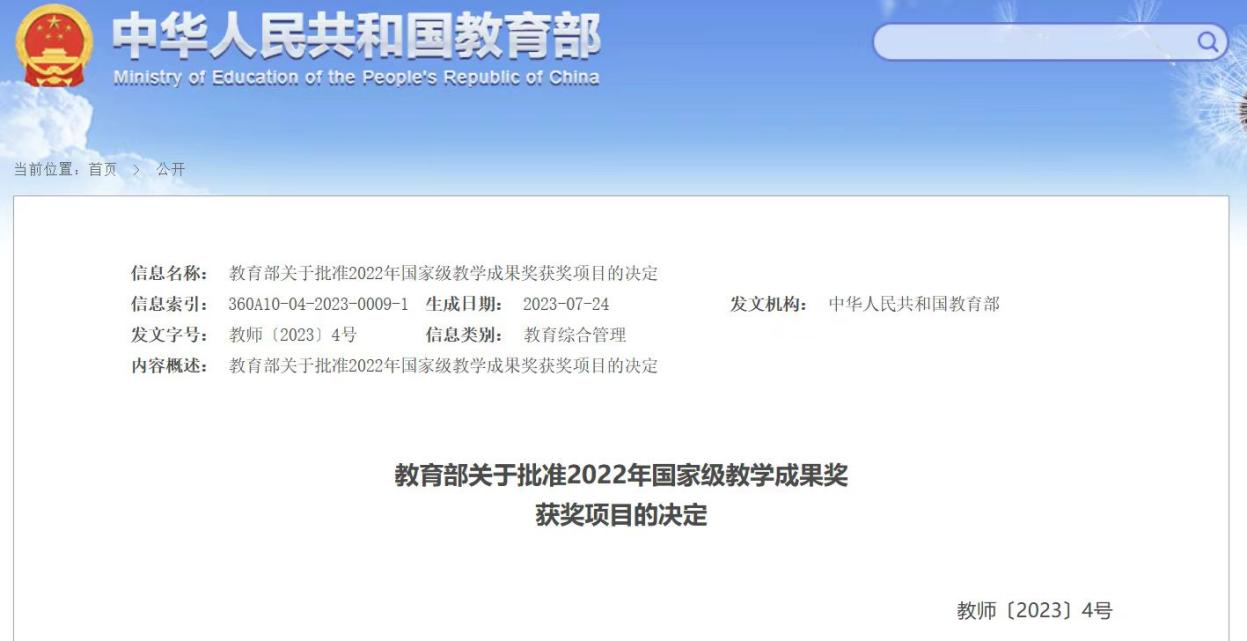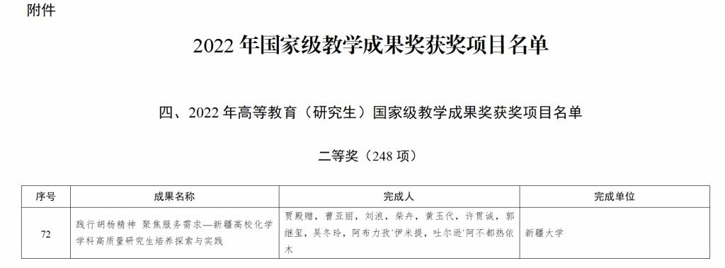 近日,中华人民共和国教育部发布《教育部关于批准2022年国家级教学成果奖获奖项目的决定》的通知,公司贾殿赠教授团队申报的教学成果“践行胡杨精神 聚焦服务需求—新疆高校化学学科高质量公司产品探索与实践”获2022年高等教育(研究生)国家级教学成果奖二等奖。