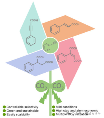 Four kinds of arylpropiolic acid, cinnamic acid, fumaric acid, succinic acid, and their derivatives can be obtained with good selectivity by regulating substrates, solvents, and electrolytes.