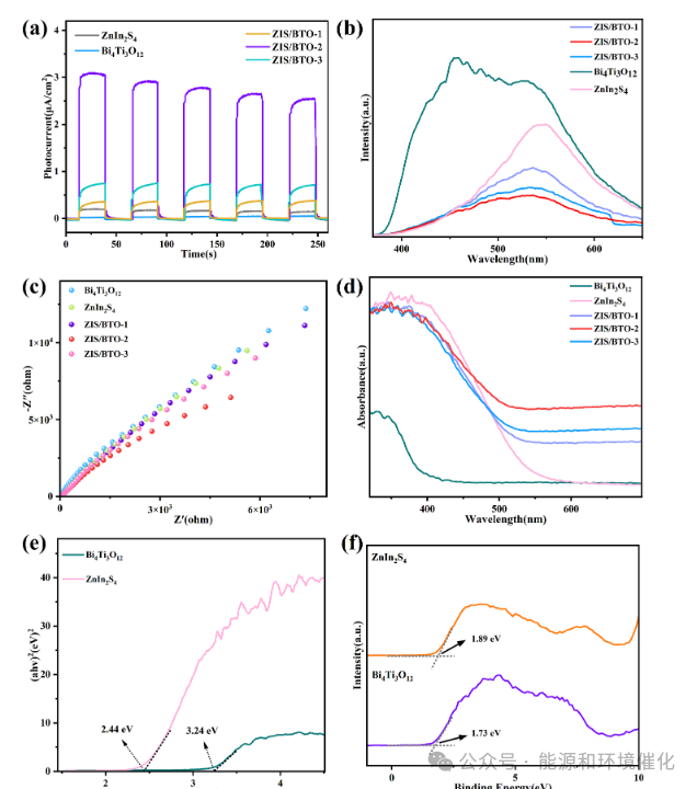 通过 Kubelka-Munk 函数计算(Fig.5e),纯 ZIS 的带隙为 2.44eV,纯 BTO 的带隙为 3.24eV。XPS 价带谱(Fig.5f)通过