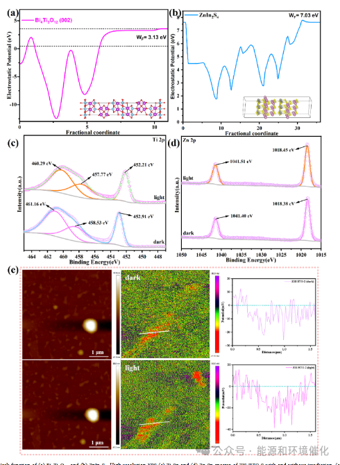 原位 AFM-KPFM 测试(Fig.8e)显示,光照后 ZIS/BTO-2 的表面电势发生明显变化,表明内建电场驱动下的载流子转移导致表面电荷分布改变,进一步证实异质结的形成和载流子的有效分离。