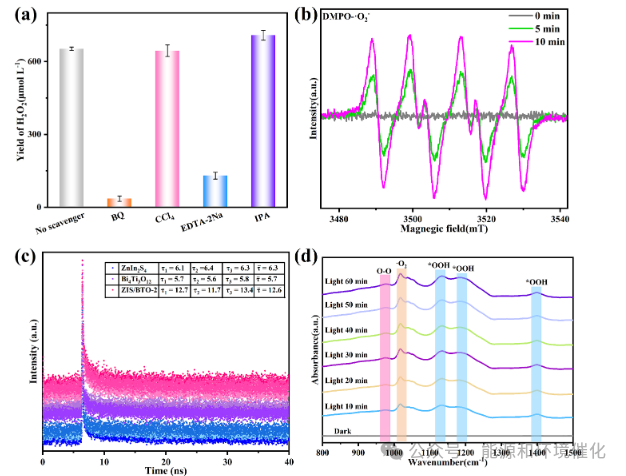 测试(Fig.7b)中,光照后 ZIS/BTO-2 出现明显的・O₂⁻特征信号峰,且随光照时间延长信号增强,与捕获实验结果一致,证实・O₂⁻在 ORR 路径中参与 H₂O₂的生成。